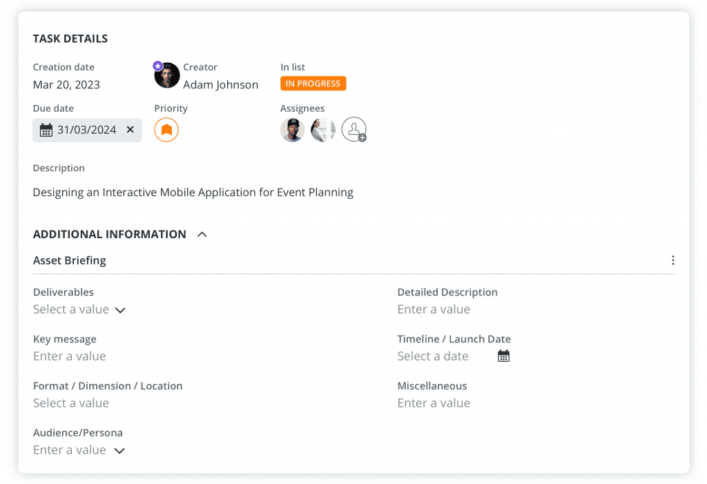 Ein weiterer wichtiger Vorteil der Briefing-Formulare in CELUM ist, dass sie individuell gestaltet werden können. Das heißt, du kannst verschiedene Briefing-Vorlagen für unterschiedliche Projekttypen erstellen. Du fügst dann die entsprechende Vorlage zu einem Projekt hinzu und füllst alle erforderlichen Informationen aus, als ob du ein Formular ausfüllen würdest.