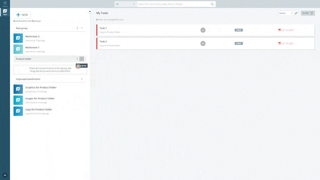 Befreie deine innere Marie Kondo und priorisiere, gruppiere und ordne alle Projekte nach deinen persönlichen Bedürfnissen. Nachdem du dich angemeldet hast, siehst du als Erstes die neue Cockpit-Übersicht. Die linke Seite des Bildschirms ist der Verwaltung und Organisation gewidmet: Du kannst neue Gruppen erstellen, diese nach oben oder unten verschieben, schnell neue Workrooms anlegen oder komplexere Workrooms auf Basis von Vorlagen erstellen.