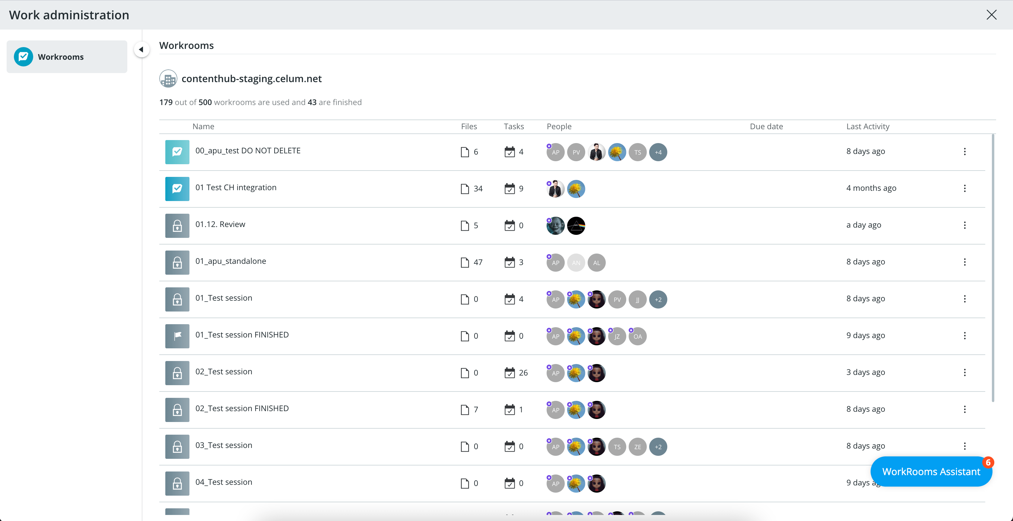 Benutzer mit der entsprechenden Berechtigung können von dort aus einen Workroom beenden, löschen oder wieder öffnen. Außerdem zeigt das Dashboard die letzte Aktivität in jedem Workroom an und wie viele Aufgaben erstellt und Dateien hinzugefügt wurden.