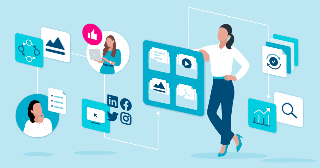 - Verwalte Inhalte von Anfang bis Ende und nutze deine Marketing-Assets über alle digitalen Touchpoints hinweg.