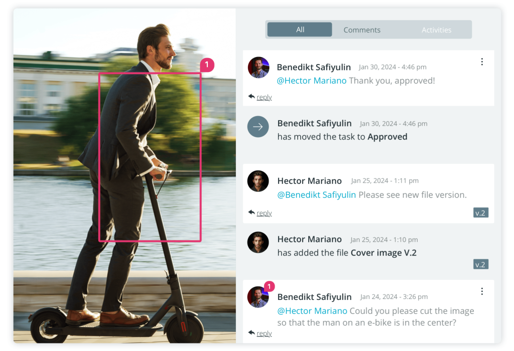 Keine Ratespiele mehr – teile präzises und umsetzbares Feedback und kommentiere Bilder, Videos, Audiodateien oder Dokumente mit Marker-Tools.