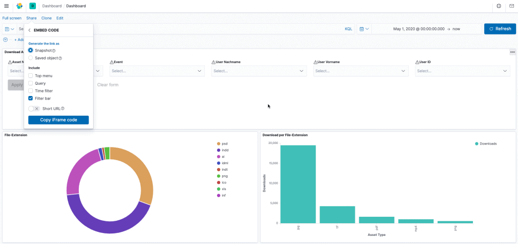 Kibana-Visualisierungen ganz einfach mit anderen im Team teilen – bette ein Dashboard ein, teile einen Link oder exportiere deine Daten (PDF, PNG, CSV) und verschicke sie als Anhang. Organisiere deine Dashboards und Visualisierungen in Kibana-Spaces.