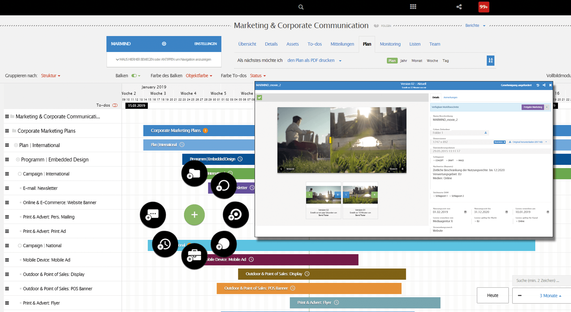 Integration of media assets from CELUM into a central media and campaign plan. Simple correction loops and cross-departmental approval processes for internal and external users. Direct export of media assets to CELUM with metadata and context selection.